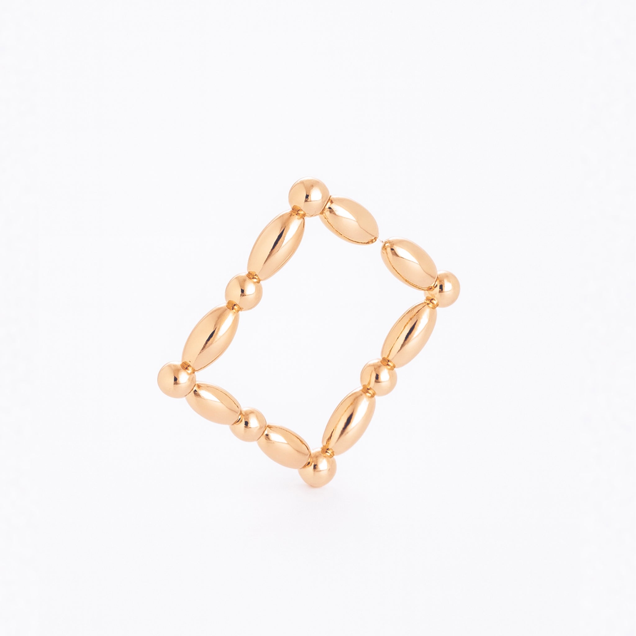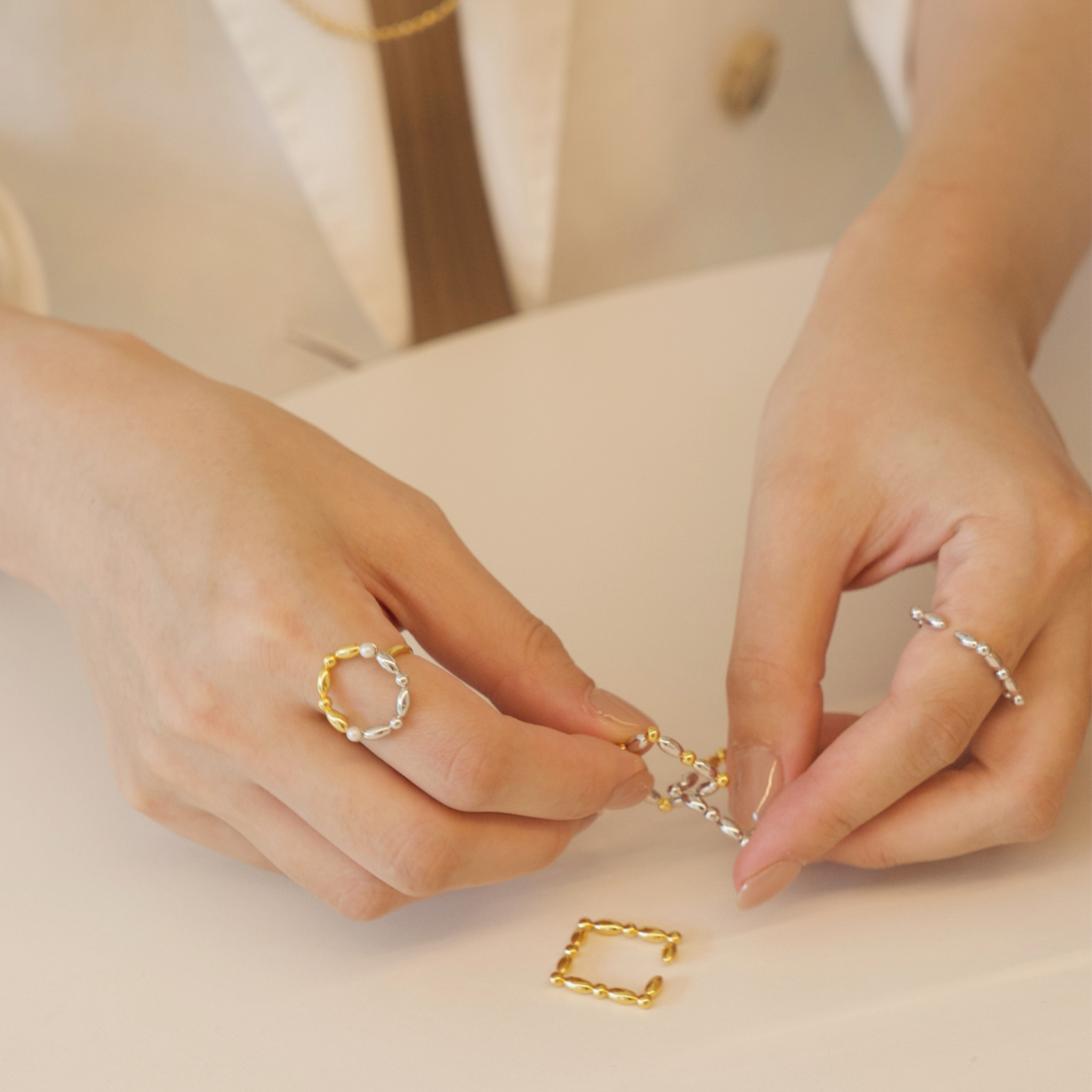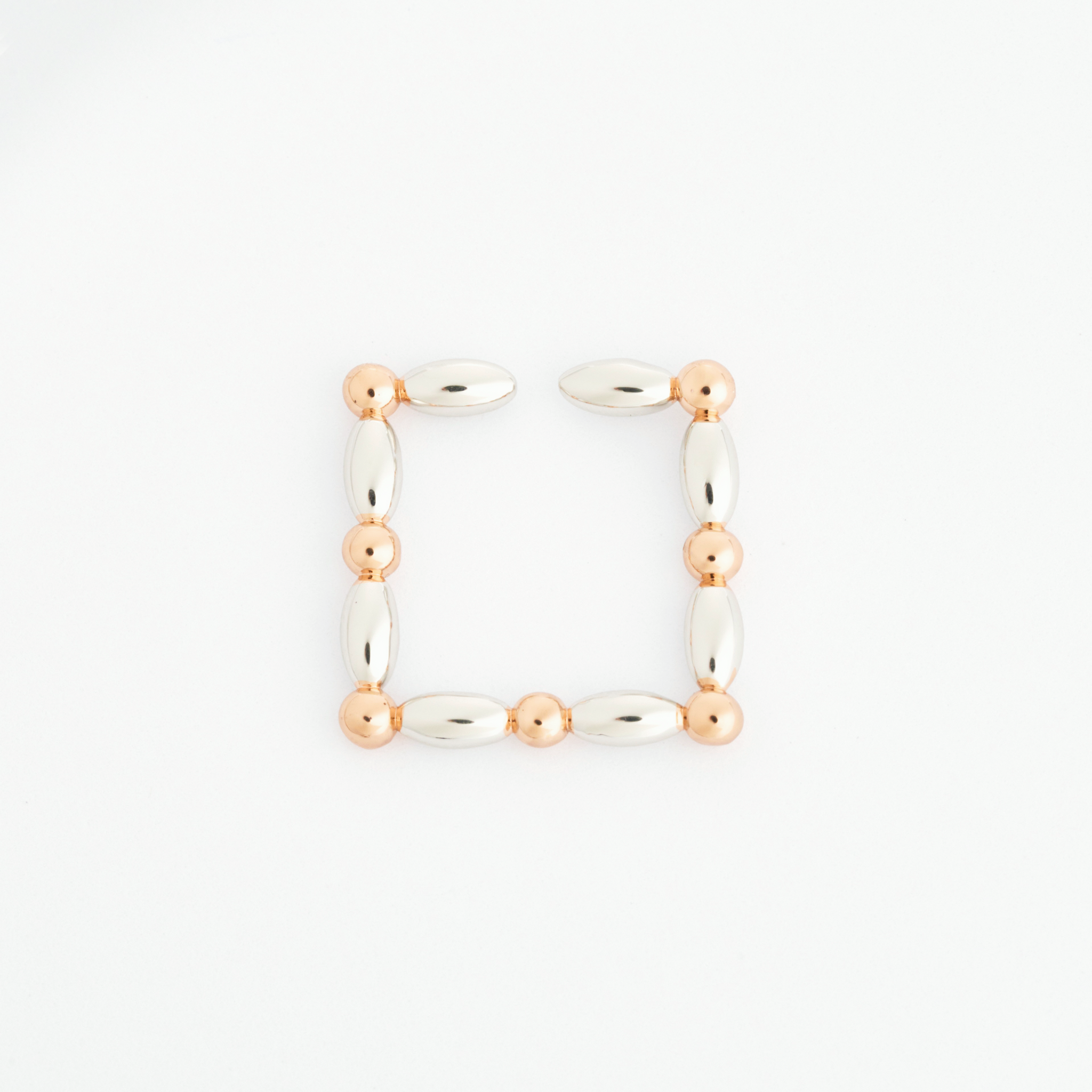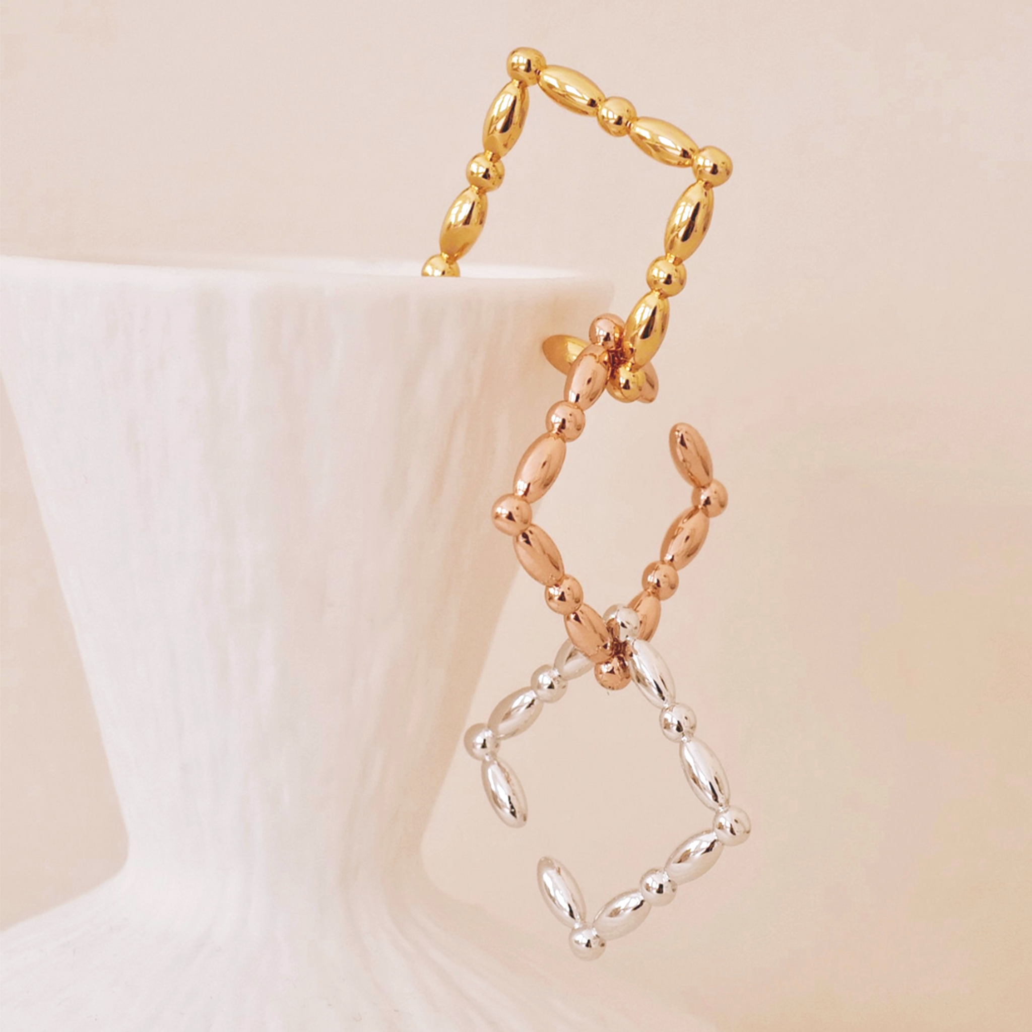 Helena 延續「串珠」系列靈感,將以往俐落的幾何線條轉化為柔和的圓弧造型。金、銀、玫瑰金色調交錯排列,在光影間展現輕盈而多變的層次感。