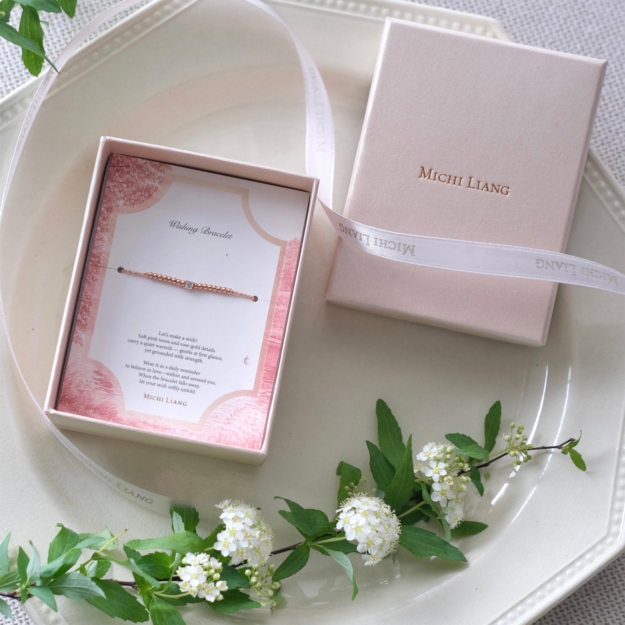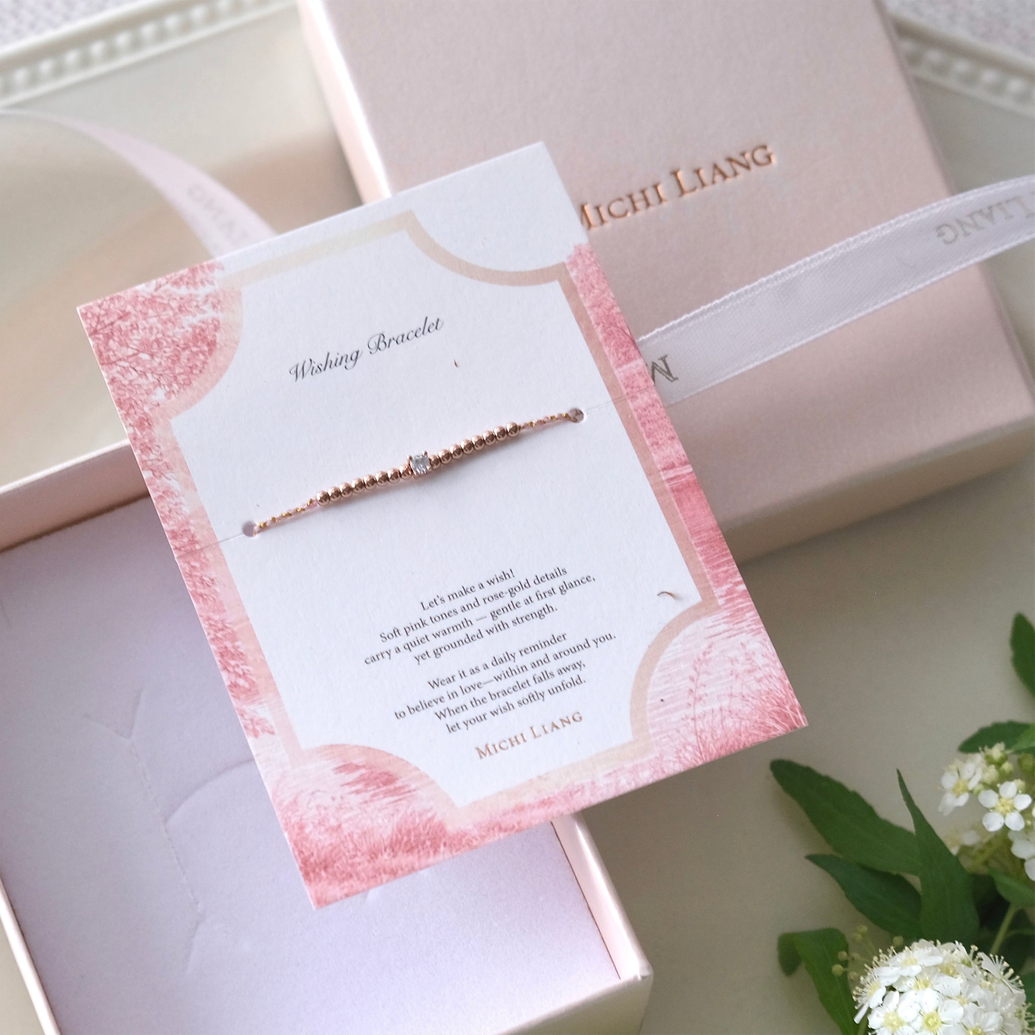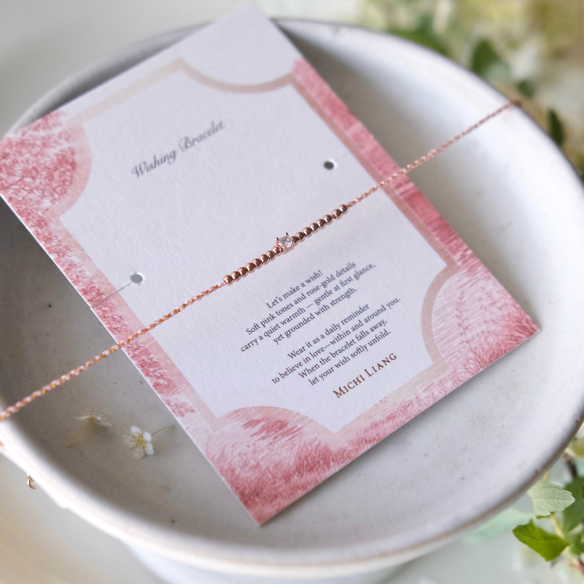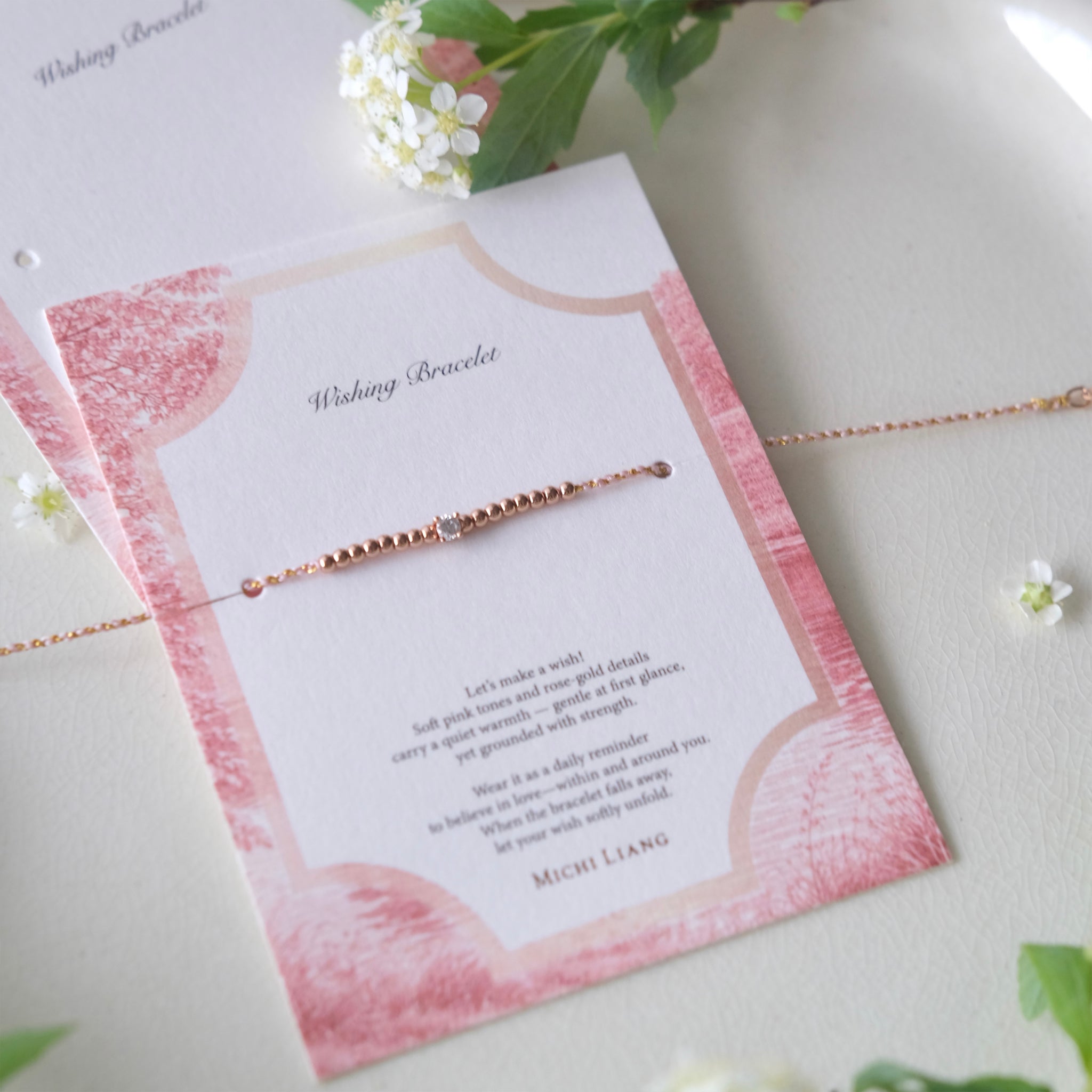 淡雅的粉金手工綁繩也與玫瑰金細節相映。在低調之中,展現柔和而安定的力量!每處細節皆蘊含不同祝福巧思: